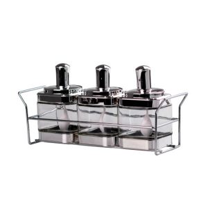 Металева підставка робить набір компактним і зручним для розміщення на кухонному столі або в шафі, забезпечуючи порядок та швидкий доступ до всіх баночок.